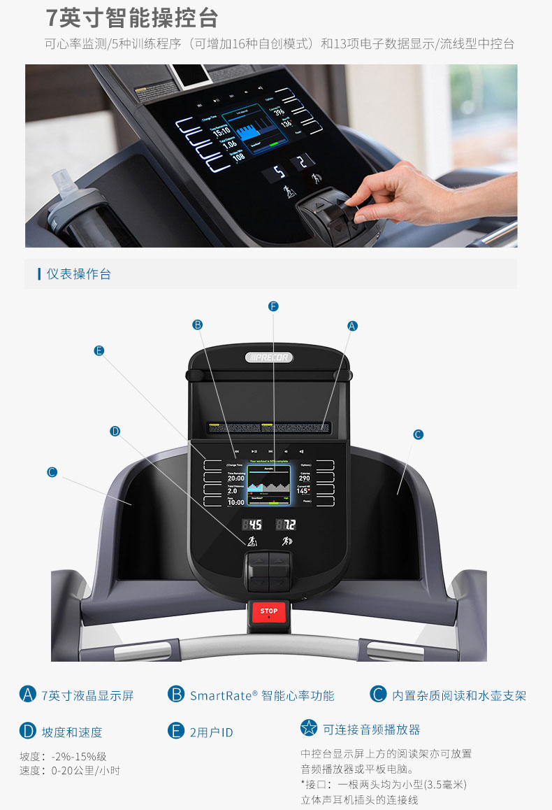 这是一款家用型静音跑步机,拥有7英寸的智能操控台,高对比度液晶屏头脑,掌控着一切程序。
